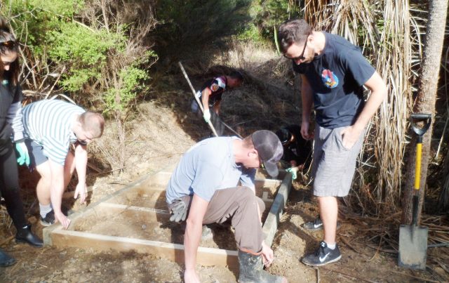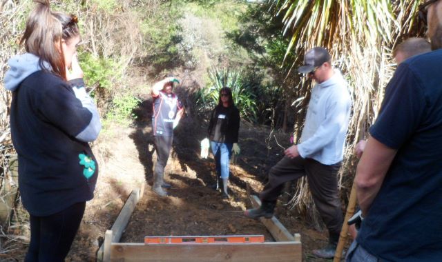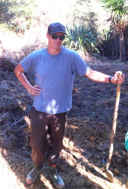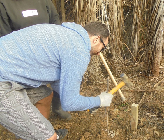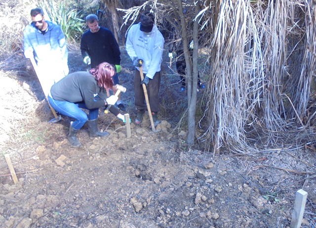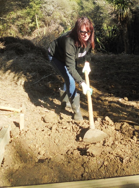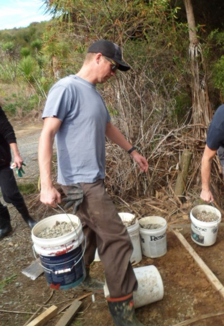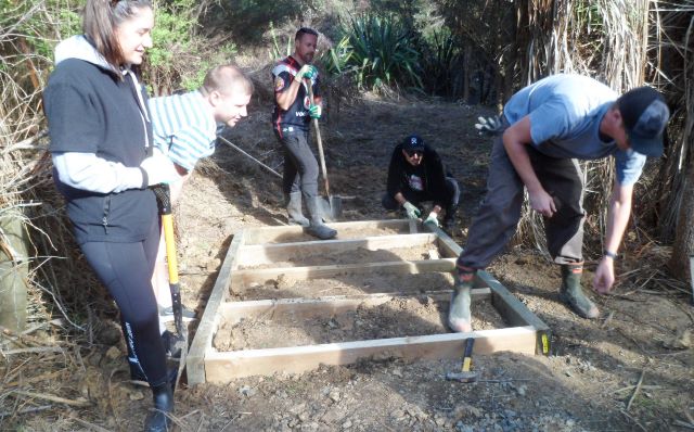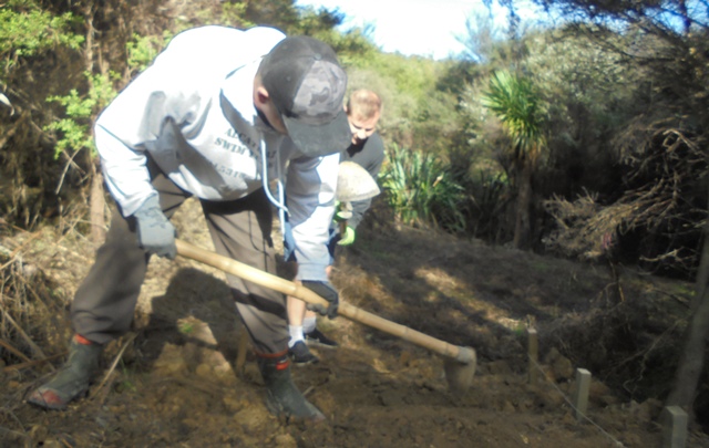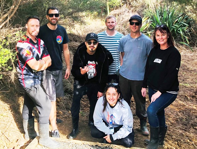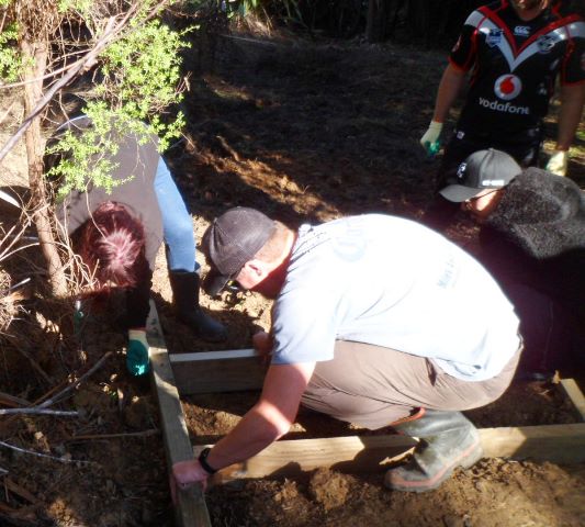 The plan for the day was to work on creating entry steps to a part of the property that we will be using for memorial plantings. The area is a wetland and currently only accessible from the road by climbing down an uneven and slippery hill. We wanted to widen the entry and install some steps so that visitors can easily access an area that will become a beautiful grove of kahikatea.