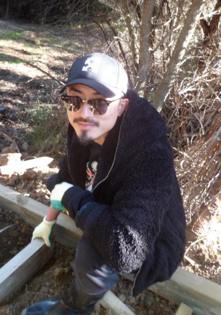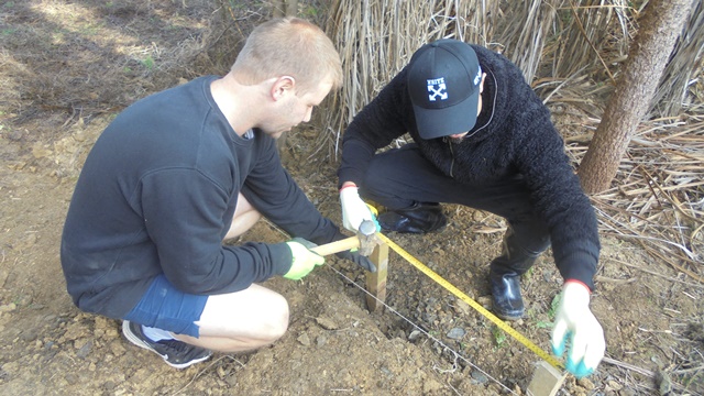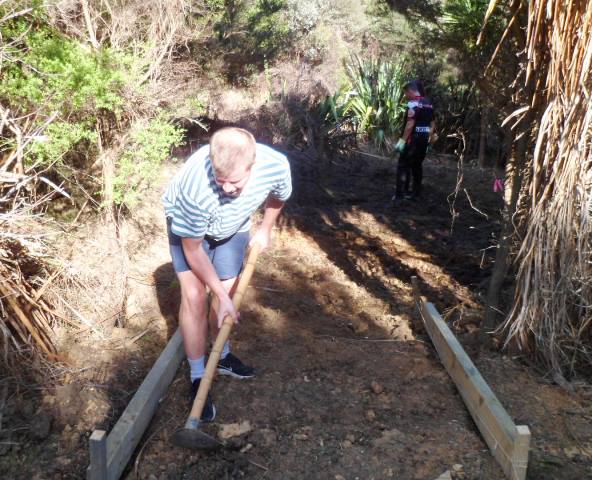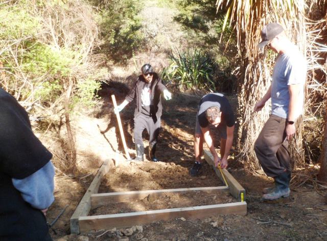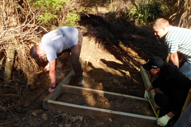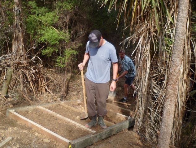 While most of the team dug and formed the steps, Jamie helped Thomas cut the timber that would be needed.