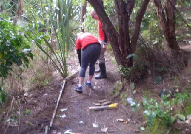 The second team tackled an interesting challenge. Several years ago, we’d installed a nice bench along the Taraire Track. However, we found that visitors weren’t using it because it was set up too high and it was easier to just sit on the step up to the bench. As a result of disuse, the bench area had become overgrown with (good and bad) vegetation. We asked the team to clear the area around the bench and come up with an easier access to the bench to encourage people to use it. This gives you an idea of the issue: