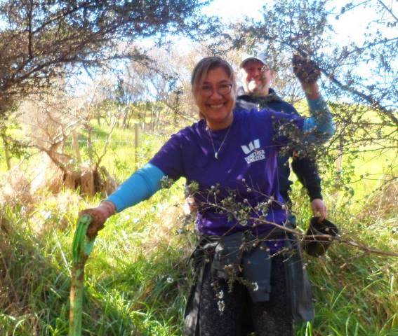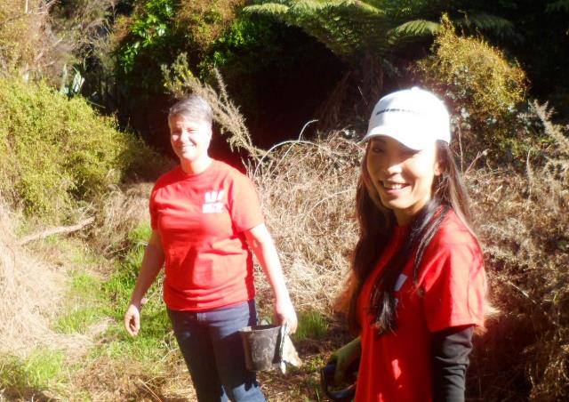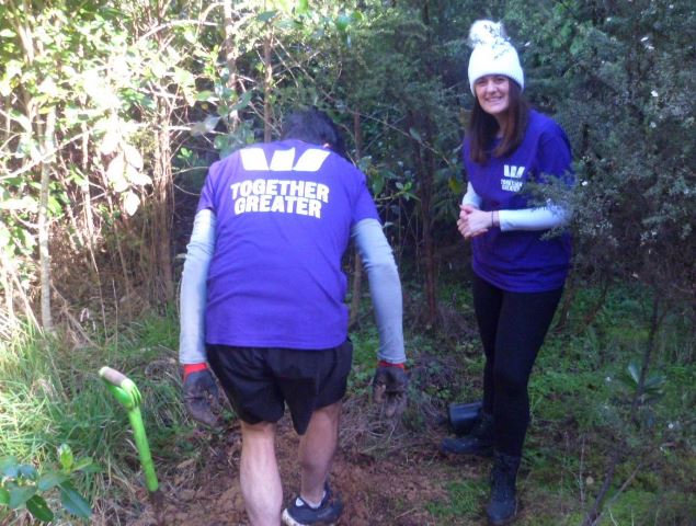 Westpac is one of New Zealand’s largest banks and they have a strong commitment to sustainability and community support. Westpac staff have been volunteering at CUE Haven for several years and today professionals from various departments in Auckland visited CUE Haven to help us with some tree planting and a variety of other tasks. The team arrived first thing in the morning and included Afiafi, Anne, Ashleigh, Elise, Glen, Hannah B., Hannah E., Josh, Luke, Nick, Sacha and Zoe. Also joining us for the day was Afiafi’s husband, William, who took the day out from his work to help out today, and our good friend and regular volunteer Alan.