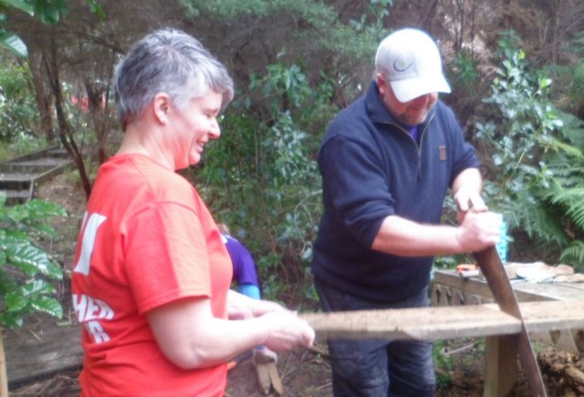 While the two teams were in the bush working on the tracks, the third team worked with Alan on building benches. While we were planting, Alan planned out a bench style. The first task was to prepare the timber and cut the pieces.