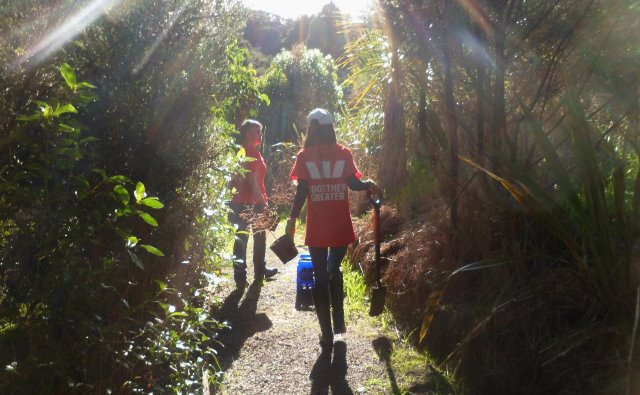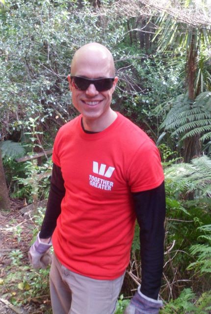 Westpac is one of New Zealand’s largest banks and they have a strong commitment to sustainability and community support. Westpac staff have been volunteering at CUE Haven for several years and today professionals from various departments in Auckland visited CUE Haven to help us with some tree planting and a variety of other tasks. The team arrived first thing in the morning and included Afiafi, Anne, Ashleigh, Elise, Glen, Hannah B., Hannah E., Josh, Luke, Nick, Sacha and Zoe. Also joining us for the day was Afiafi’s husband, William, who took the day out from his work to help out today, and our good friend and regular volunteer Alan.
