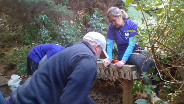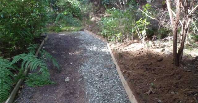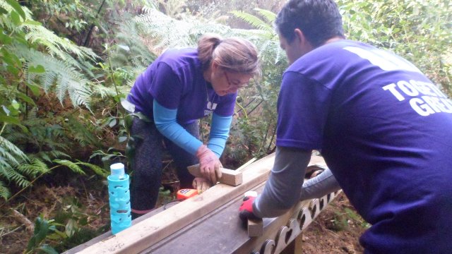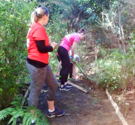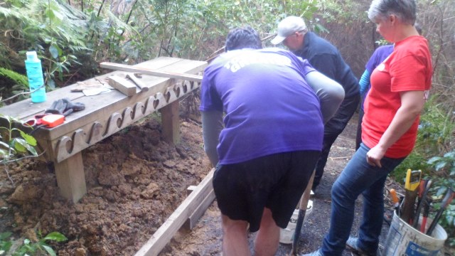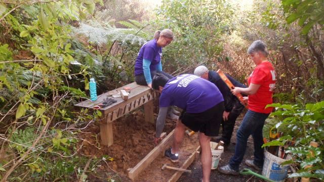 The second team tackled an interesting challenge. Several years ago, we’d installed a nice bench along the Taraire Track. However, we found that visitors weren’t using it because it was set up too high and it was easier to just sit on the step up to the bench. As a result of disuse, the bench area had become overgrown with (good and bad) vegetation. We asked the team to clear the area around the bench and come up with an easier access to the bench to encourage people to use it. This gives you an idea of the issue: