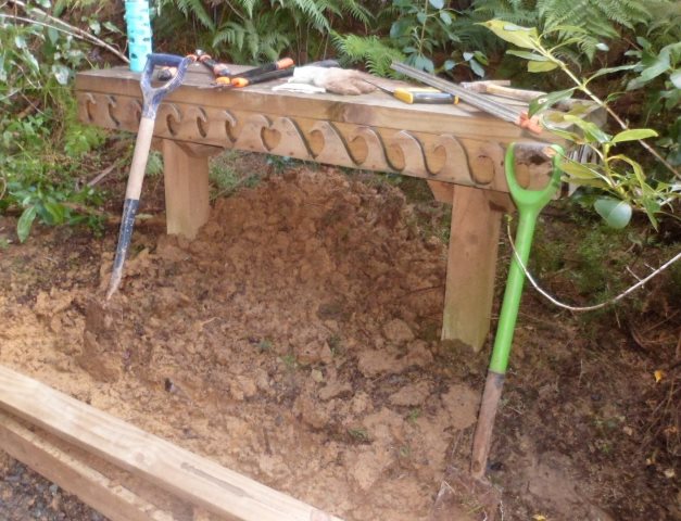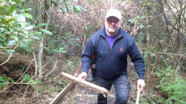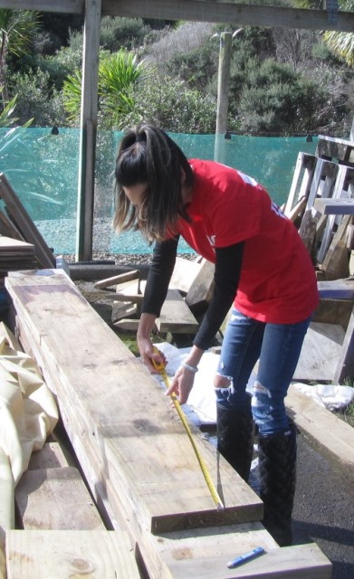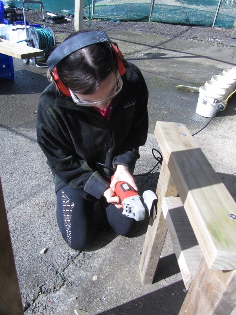 While the two teams were in the bush working on the tracks, the third team worked with Alan on building benches. While we were planting, Alan planned out a bench style. The first task was to prepare the timber and cut the pieces.