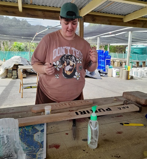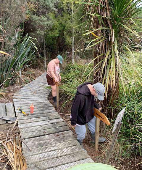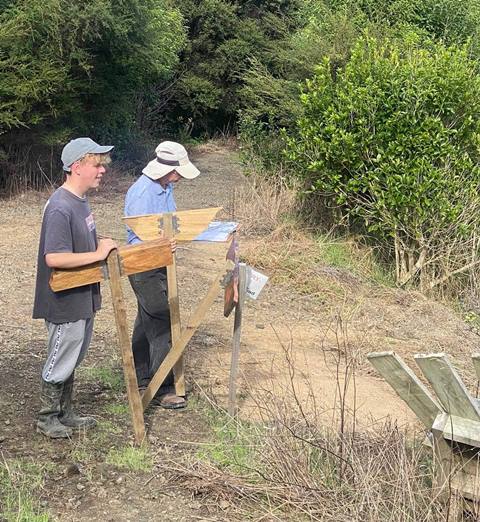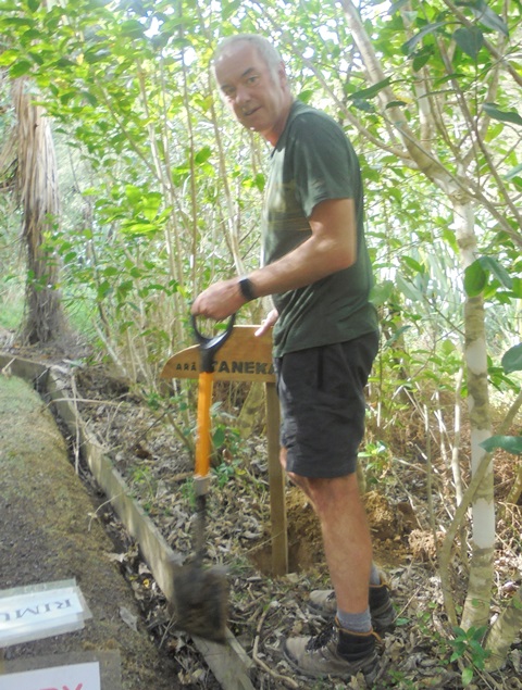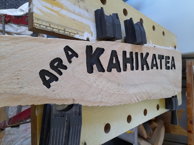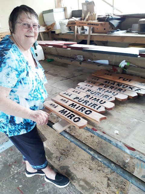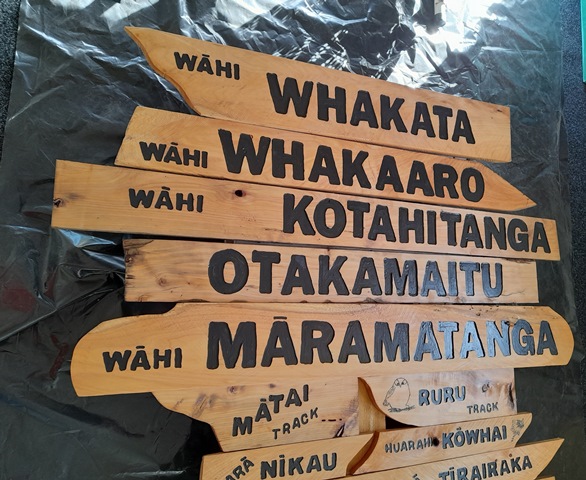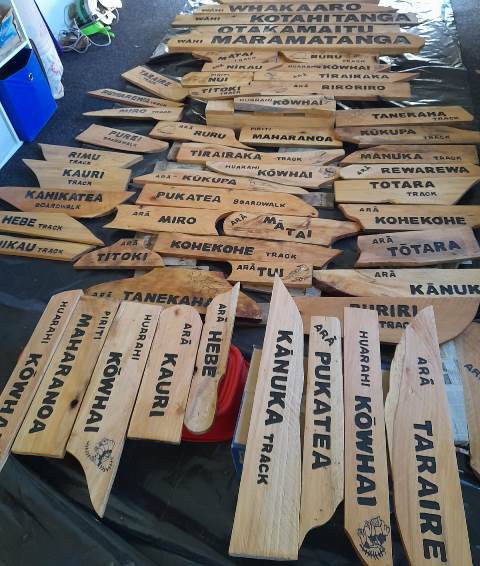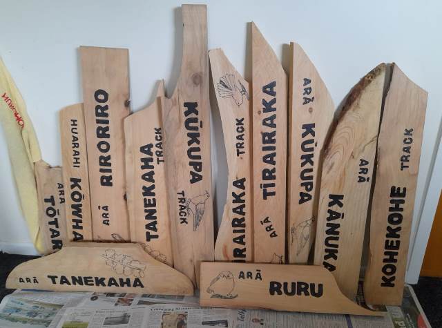 Not only did we need at least two signs for each track (Arā) and road (Huarahi), we also requested Rosemarie to make signs for the bridges (Piriti) and the various open spaces (Wāhi) where we host educational sessions for students and for the areas used by visitors for picnics.