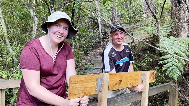 During the family’s visit to CUE Haven last year, Rosemarie noted that the track directional signs at CUE Haven were weathered and needed replacement. So the very artistic and industrious Rosemarie volunteered to hand craft some long lasting signs to mark the walking tracks and picnic areas.