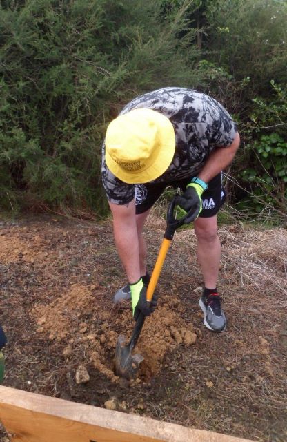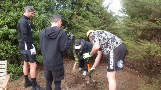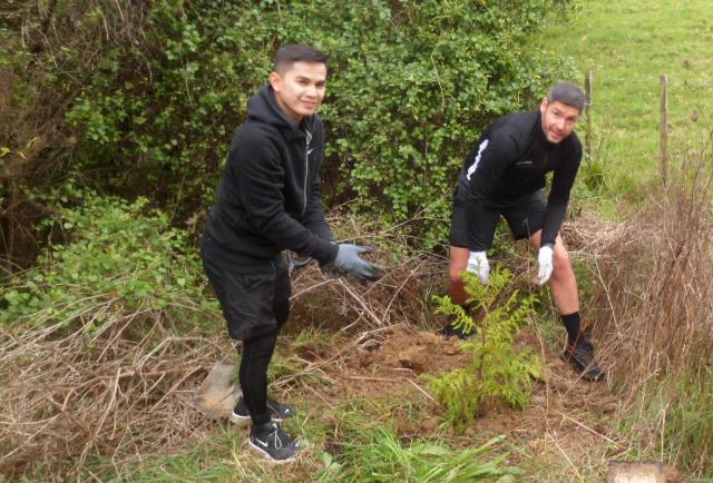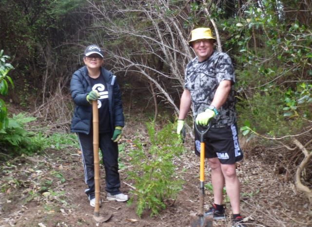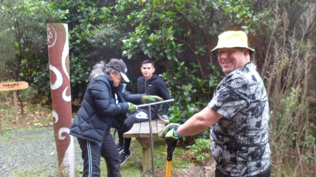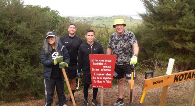 Once all the signs were installed we requested the team to do a little tree planting. We were fortunate to source two kawaka trees—New Zealand cedar. As far as we know, there is only one other kawaka tree at CUE Haven. We found good locations where the trees would be close to each other.