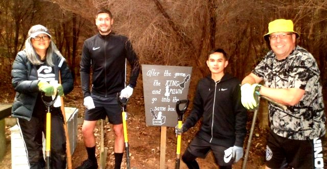 Once a sign was installed, we moved to the next one. The second sign was installed in the bush near the outdoor chess board.