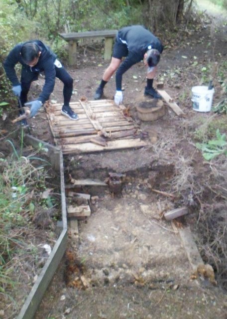 The last task that we asked this team to tackle was to repair a small bridge that was beginning to deteriorate. The top boards were fine but the underlying support structure was beginning to rot away. The first task was to remove the old bridge to assess the situation.