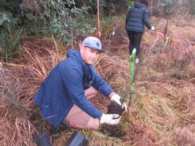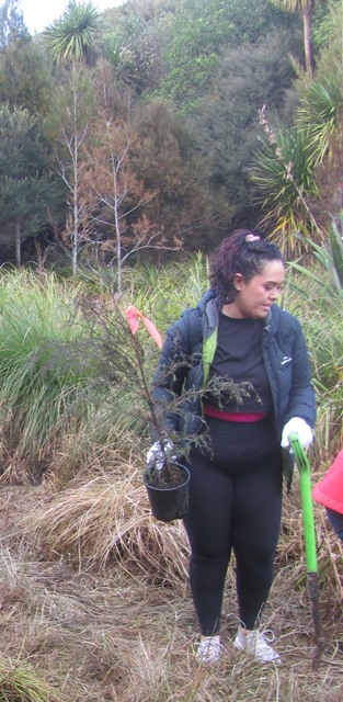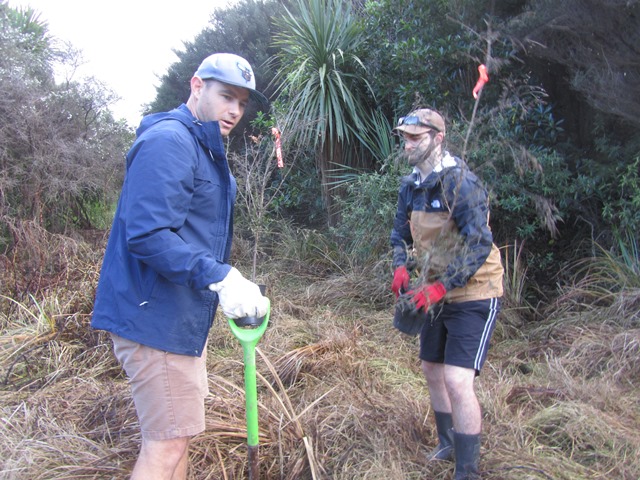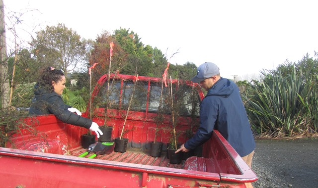 We had some kahikatea trees to add to the grove of kahikateas in one of the wetlands. Thomas’ team loaded the trees and gear into the ute and drove to the site.