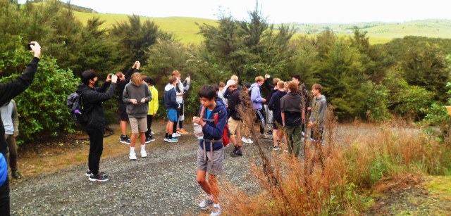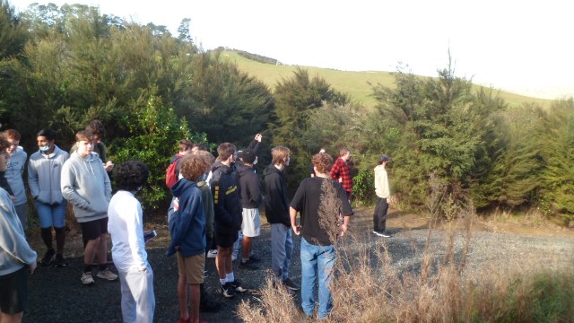 Near the top of the property, the students had a good look at the Kaipara Harbour. They were able to see how the CUE Haven stream feeds the Araparera River and in turn the Harbour. And were also able to see a variety of land uses—farming, forestry, restoration and residential adjoining the CUE Haven property to put the different things they had heard and seen into perspective.