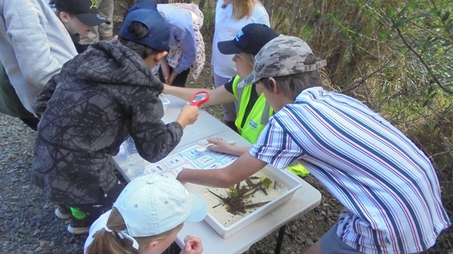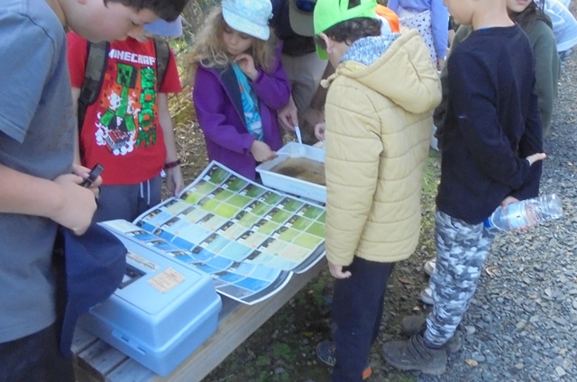 The students then broke into smaller groups and Stephanie provided each group with a tray filled with stream water, a spoon and magnifying lenses and a chart that would help them identify macroinvertebrates.