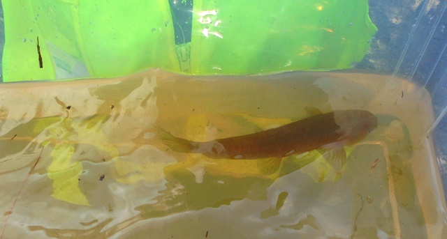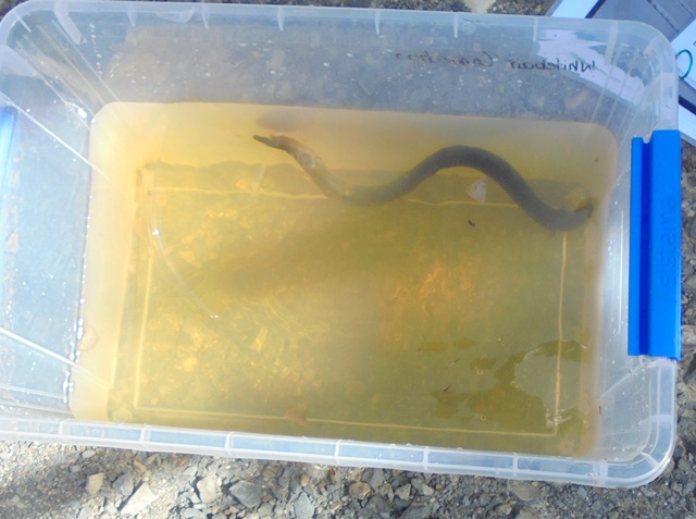 Stephanie and Sarah had set up two traps in the stream about 100 metres from the entry to the property and we went down to check on them. We were very happy to see in the first net a big banded kokopu, a native New Zealand galaxid fish.