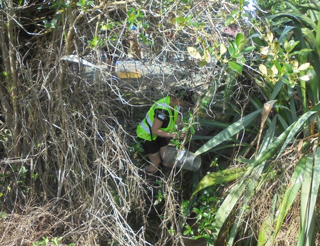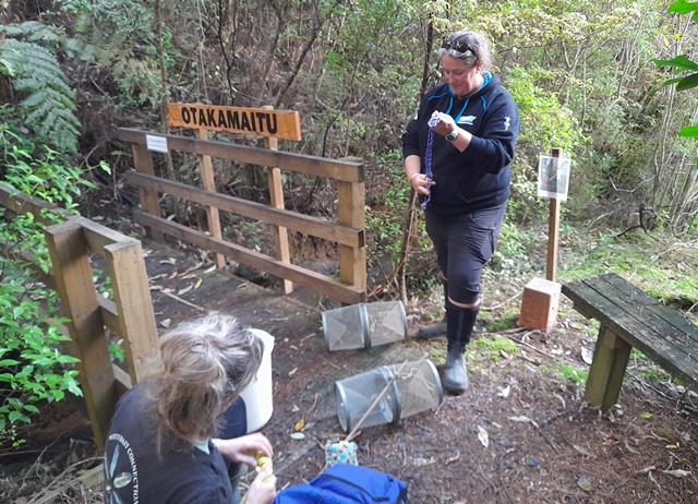 Stephanie and Sarah came out the evening before the students’ visit and set out some fish traps in Wai Matauranga, the CUE Haven stream, so the students would be able to see what larger creatures were living in the stream. We went out to various points along the stream and set the traps.