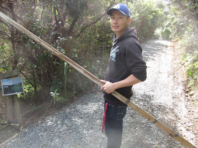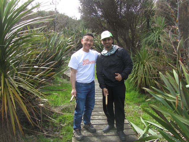 David and Nahn tackled another interesting challenge. A while ago we had installed a railing on the steps down to the wetlands boardwalk and now we wanted to extend the railing further to help people coming up/down the steps. The first task was to figure out where to place the railing and how to fix it to the boardwalk and existing rail.