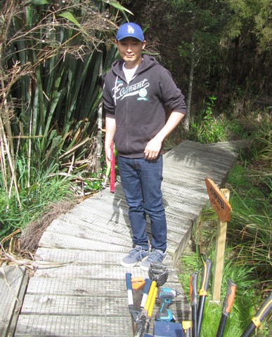 One of the annual spring maintenance tasks is trimming back overhanging vegetation from the walking tracks and boardwalks. Dawson and Max went to work with loppers and flax cutters and managed to trim back the overhanging harakeke leaves and other vegetation on the entire boardwalk.