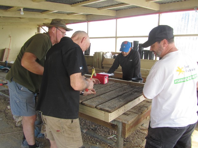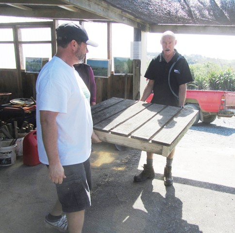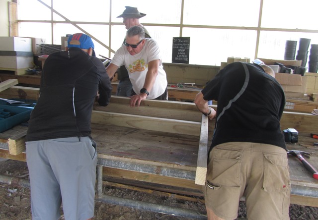 The top boards were in good shape, so the team decided build a new frame and reinstall the old top boards. We took the pieces down to the shed and removed the top.