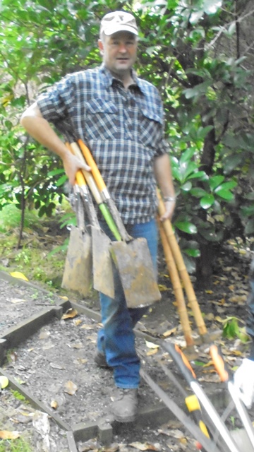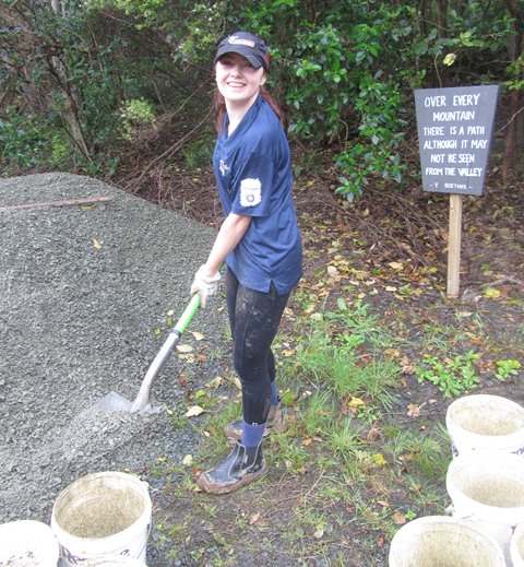 The work involved levelling off high spots and filling in low spots. It was a tedious and messy job because of the on and off rain, but the team made good progress and kept smiling.