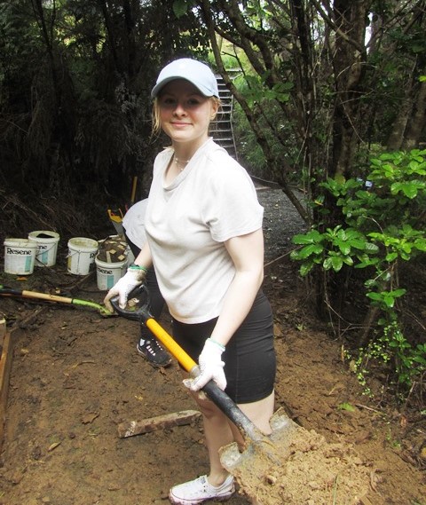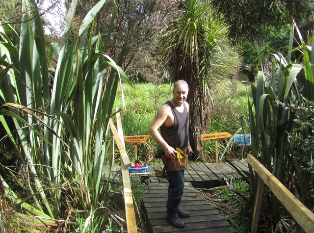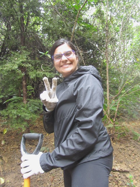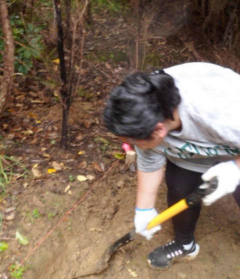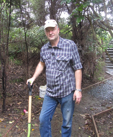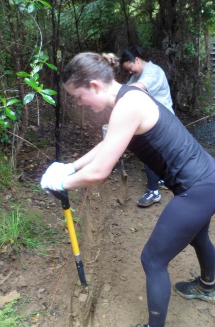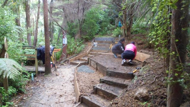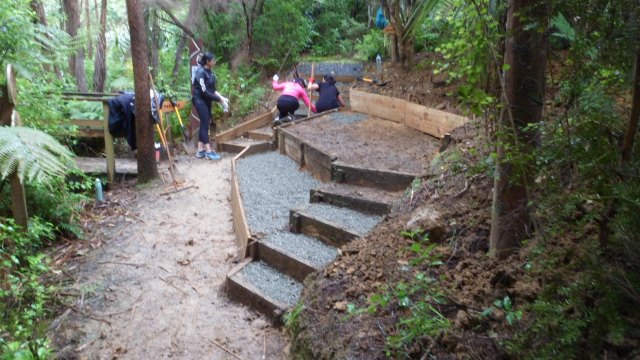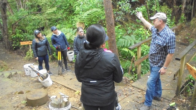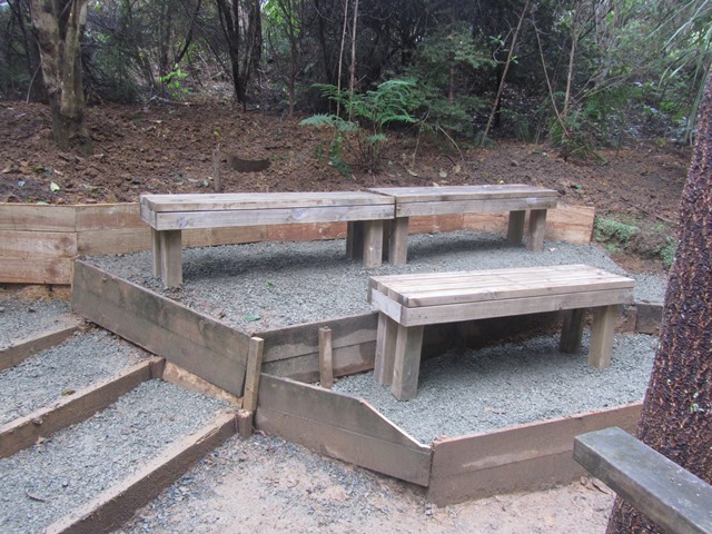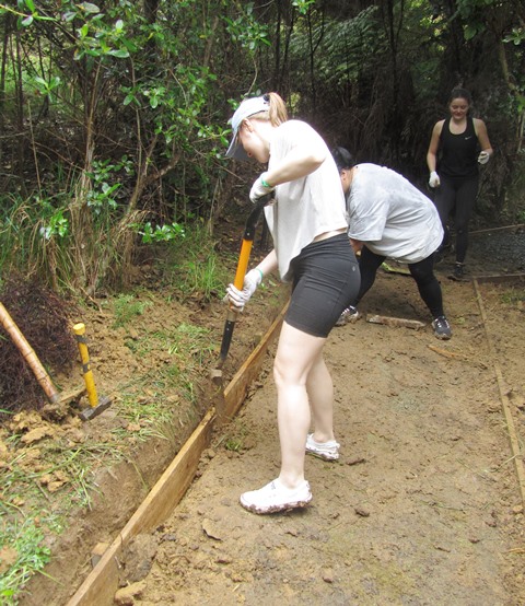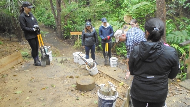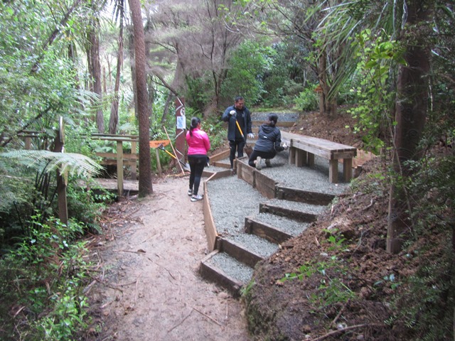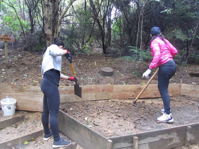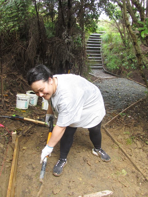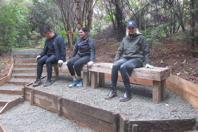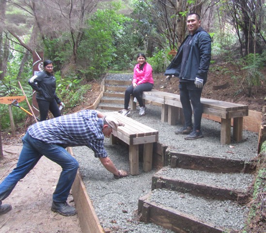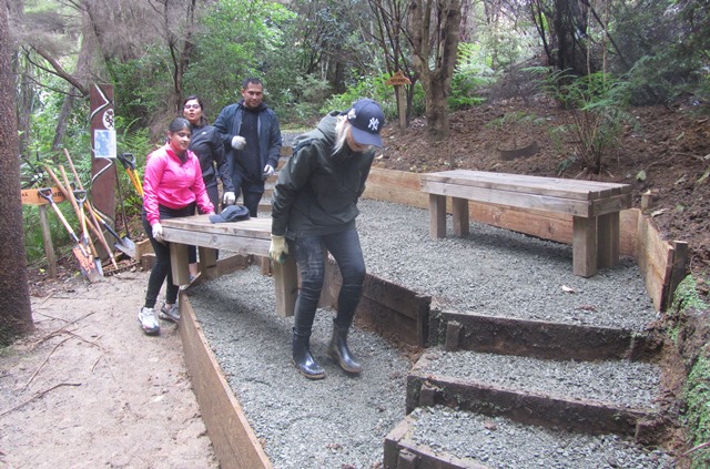While one team worked on the track section, the other team worked on finishing off a platform we have been working on at the junction of the Riroriro, Titoki and Taraire tracks. The structure had been completed, but we wanted to finish it off by levelling the ground and putting down a layer of gravel and then setting up some benches. Luke had been involved in the earlier work on the platform and explained what had been done in the past and the objective for the day.