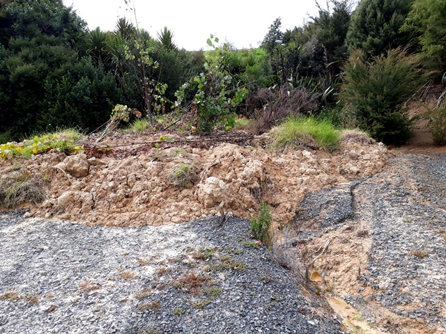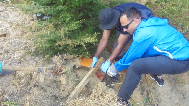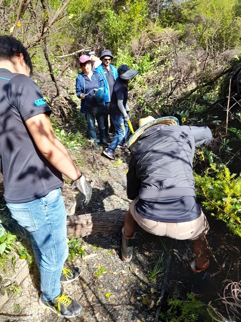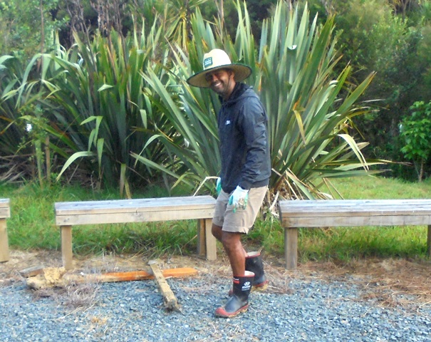 We carried the gear out to the track and went to work. We had to walk pass Wahi Matauranga where we had a big slip due to the heavy rain. Unfortunately, some of the signs were partially buried but a couple were visible at the edge of the slip. We were concerned that when the digger man clears the slip in the coming weeks the signs might be damaged beyond repair and the team kindly went to work digging out the ones that were easily accessible under the clay.