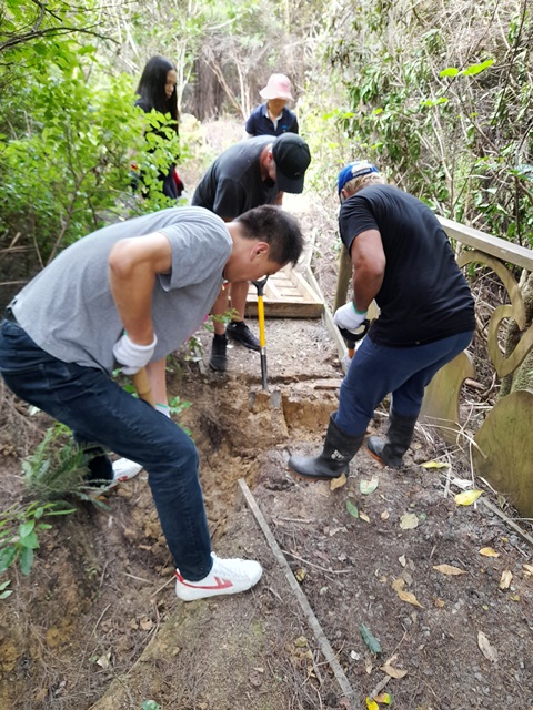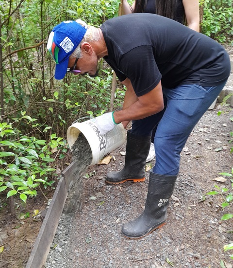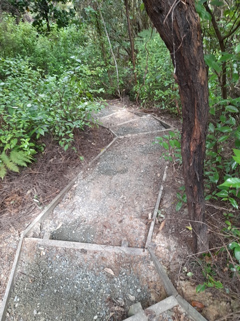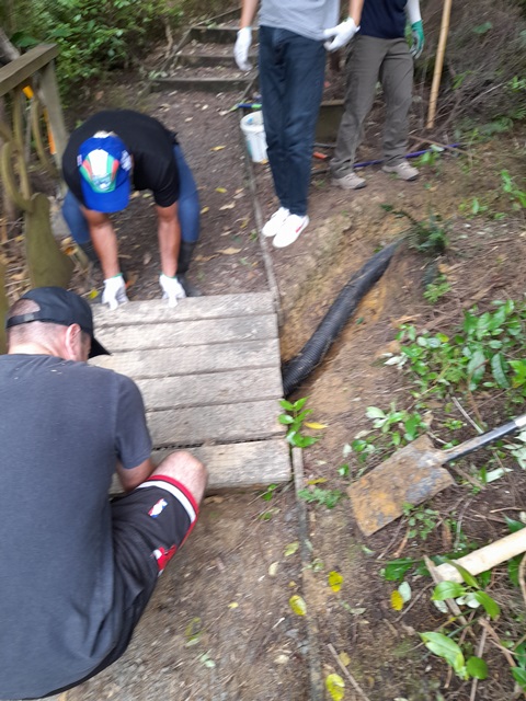 The drain flows under a bridge on the walking track and the team found that debris under the bridge had kept water from flowing downstream. They reefed up the bridge and dug out the area and installed an additional drain pipe to handle any future overflows.