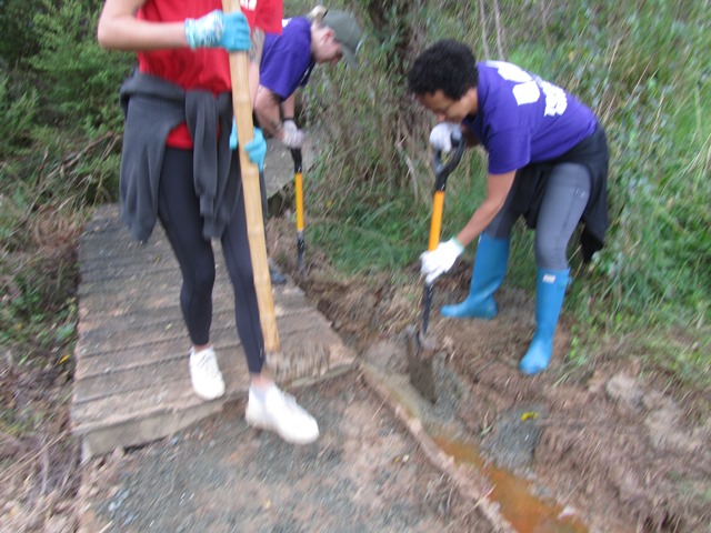 Today, the team did some additional digging to channel the water down under the boardwalk and away from the track.