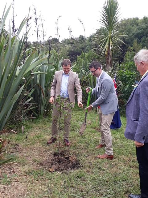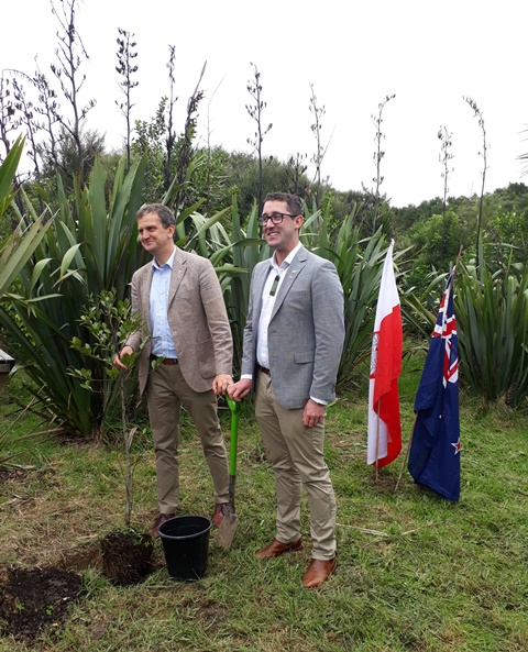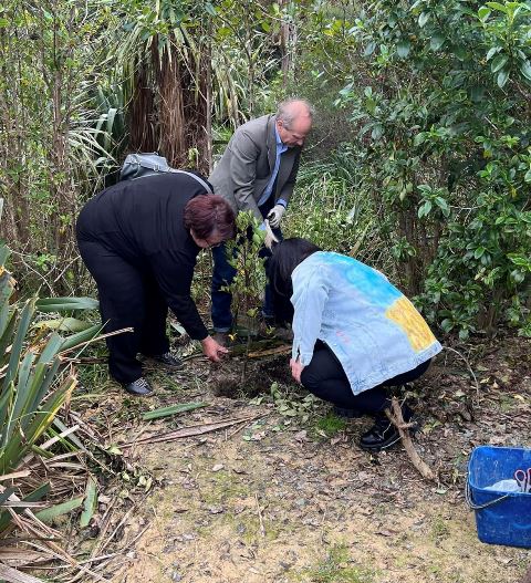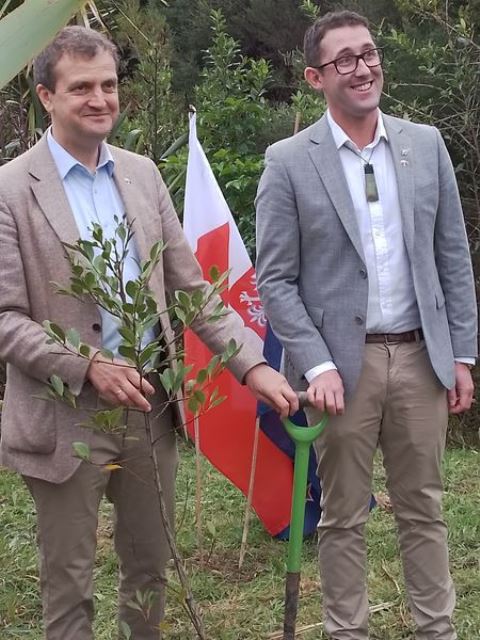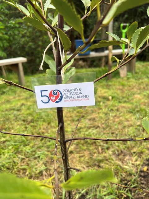 The group then took a short walk to Wahi Mautauranga where they planted two pukatea (Laurelia novae-zelandiae). One to celebrate the relationship between Poland and New Zealand was planted by Ambassador Kowal and Liam Finnigan.