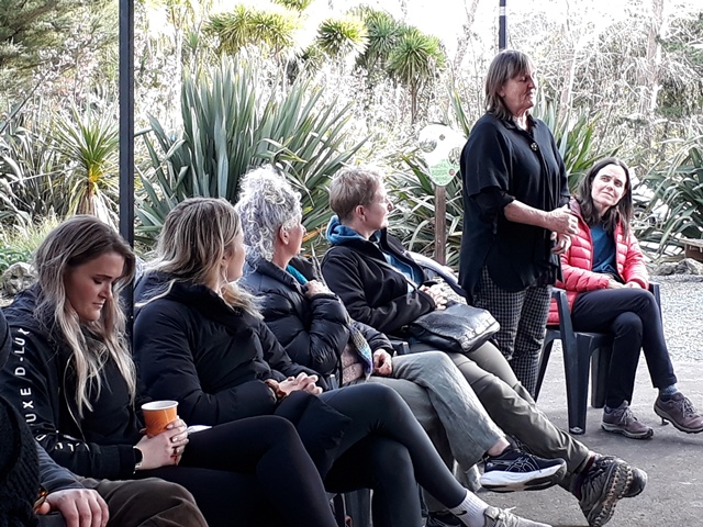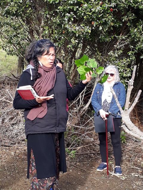 The group returned to the cottage where Marion continued the discussion and also brewed a cup of tea made from freshly picked kawakawa leaves which everyone got to sample.