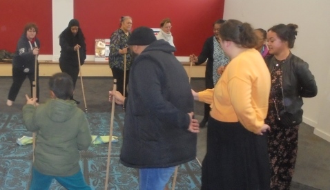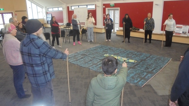 After the introductions, Rewana and Rita led the kori kori tinana (body movement exercises) the aim of which was to promote social interaction, enhance taha hinengaro (mental and emotional wellbeing), and whakatau wairua (settle the spirit) to open the mind and spirit for the activities to follow.
