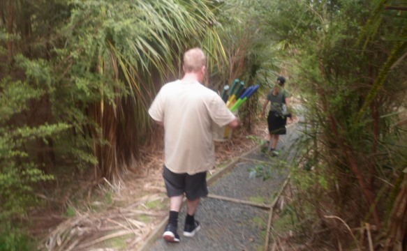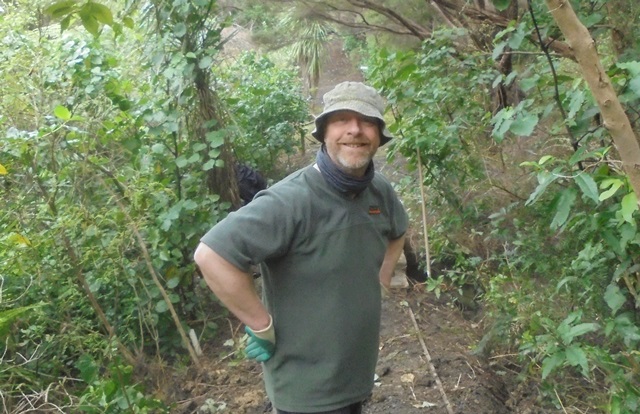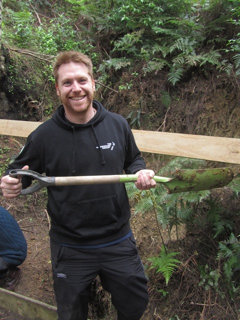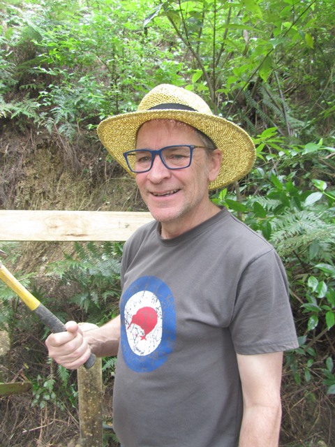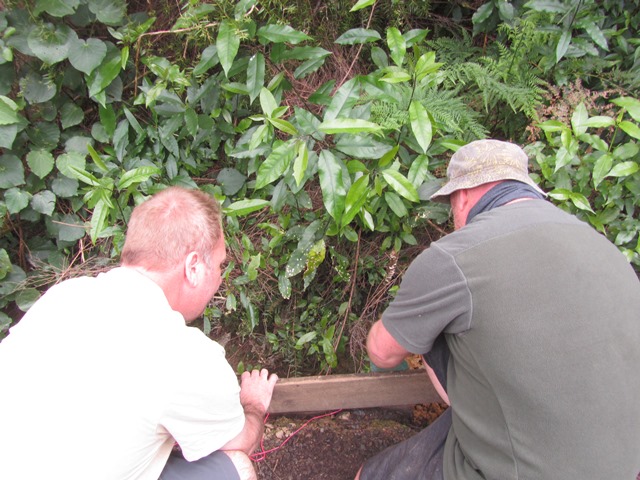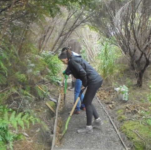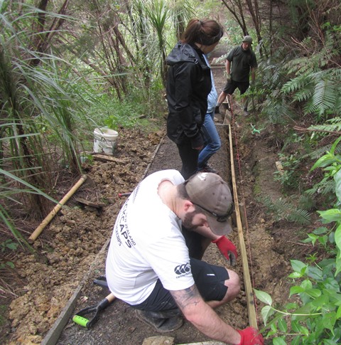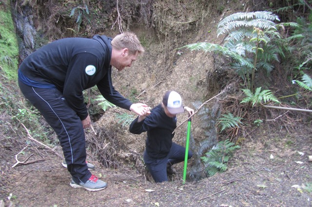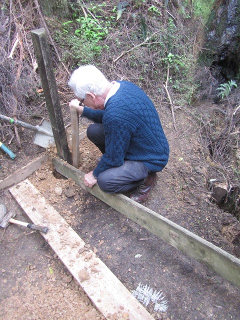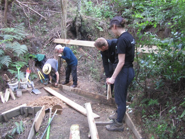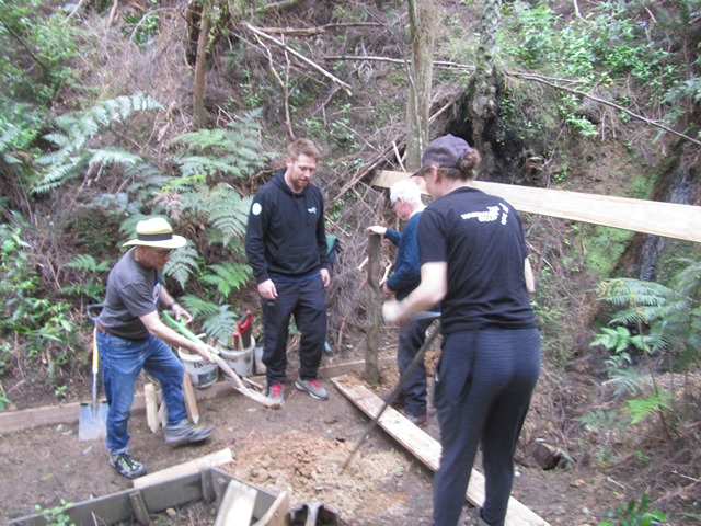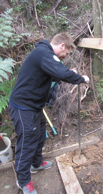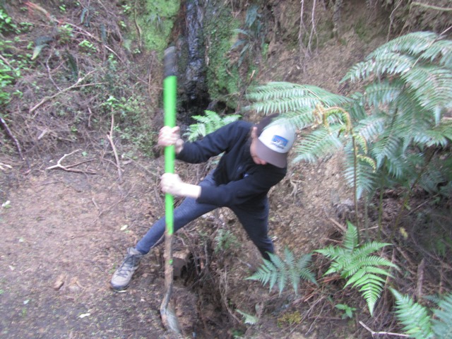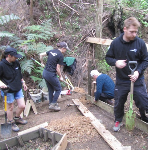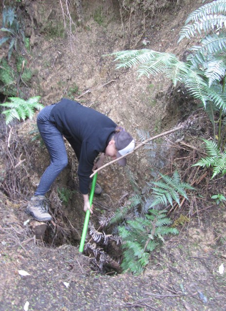 The second team tackled an interesting and unusual challenge. Near the top of the property close to where the stream rises, the walking track bends to follow the bottom of a low ridge. A portion of the stream flows over the side of the ridge resulting in a small waterfall and a little grotto where you can see glowworms at night. Unfortunately, heavy rain this year caused a slip along the ridge and we were concerned that it may have undermined the walking track.