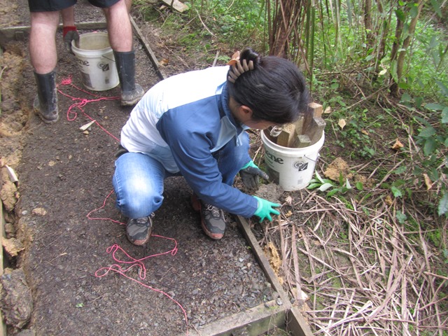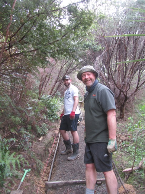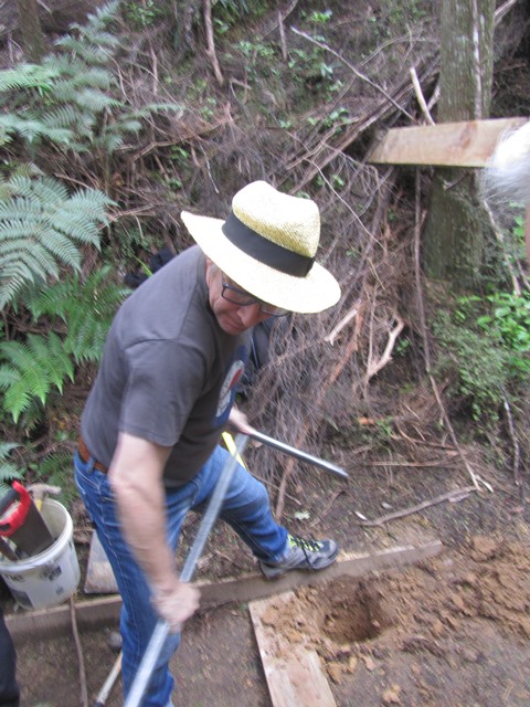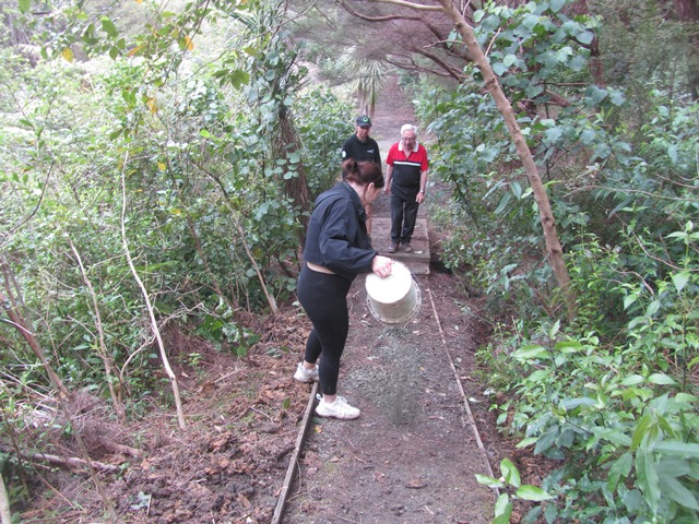 The third team worked on fixing a long sloping section of track that was badly eroded during the rain storms. Water had overflowed the drain and washed away part of the track. That undermined the retaining boards which as a result had moved out of alignment.