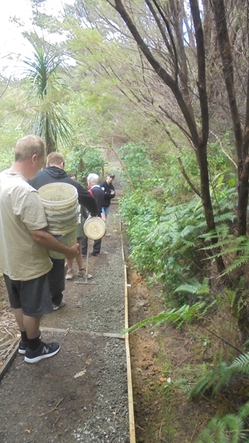To finish off the improved track section, the entire group joined up to put down a layer of gravel. We filled buckets of gravel and drove them as close to the work site as possible.