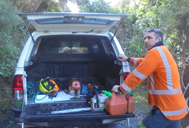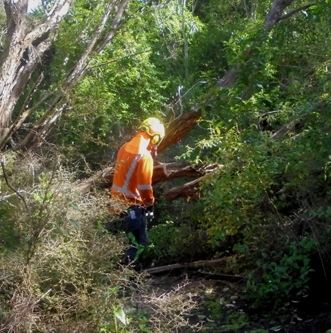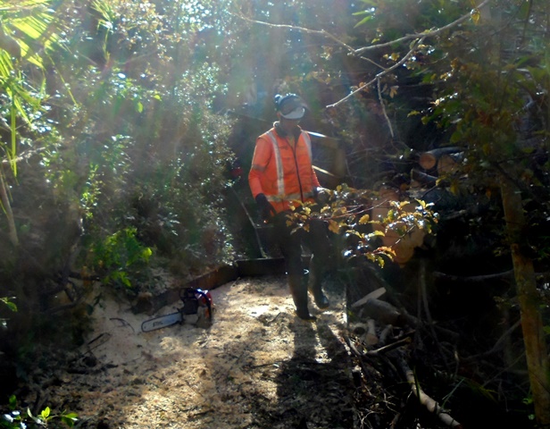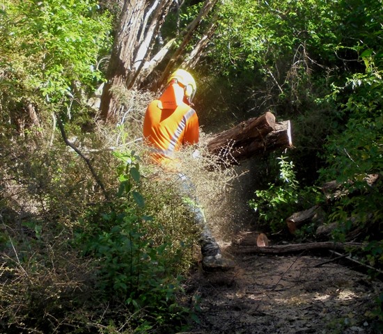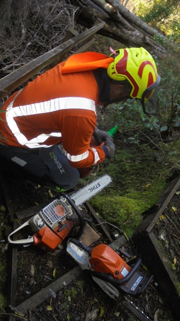 We tackled the kahikatea first. Paul studied the tree to determine the best way to remove it and made several cuts before getting the big section across the track to fall away.