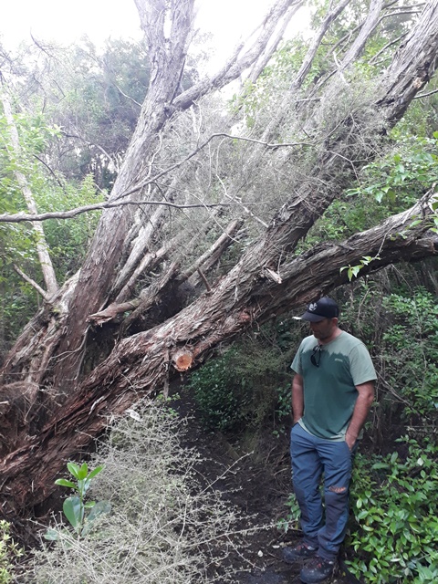 In February of this year, Cyclone Gabrielle did a lot of damage at CUE Haven with lots of downed trees which blocked roads and walking tracks. Volunteers have been able to clear most of the damage, but there were two large trees—a 150+ year old kahikatea on the Ruru track and an old kanuka on the Taraire track that required professional arborists to remove them.