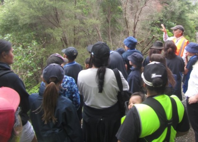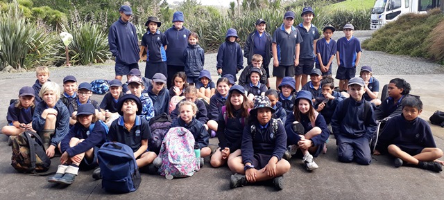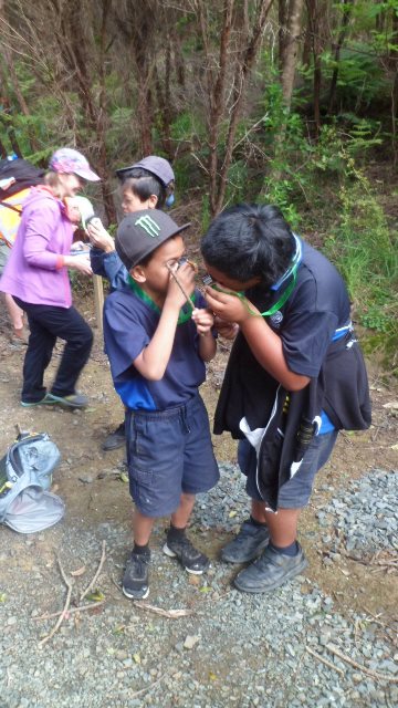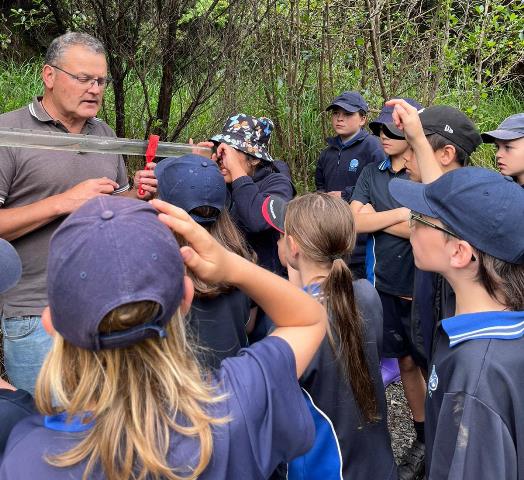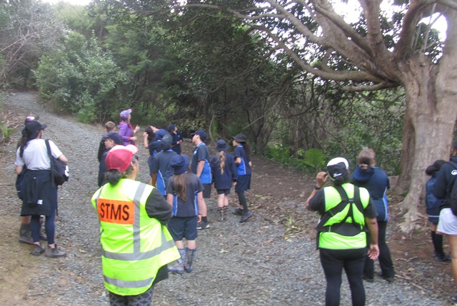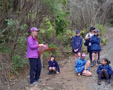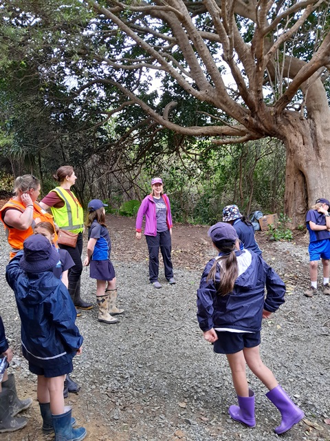 The students got a good look at the kereru, piwakawaka and tuis that were visiting the big puriri tree.