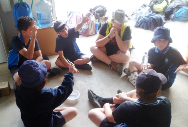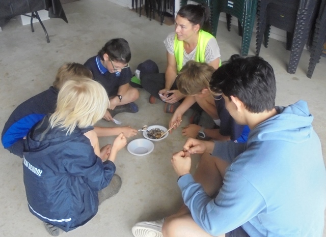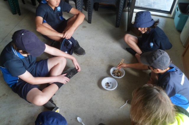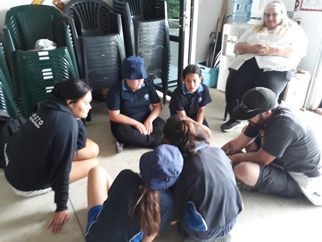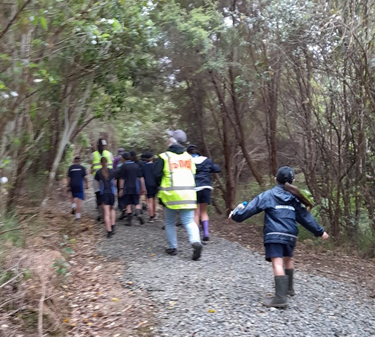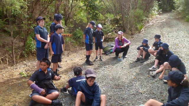 Then teacher Sue had the students break into their three groups so they could start the activities. Each group would rotate among the three activities—Waicare, nature walk and kaitiaki exercise—so that everyone would have a chance to do each activity.