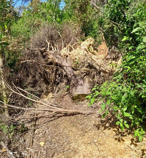 During the cyclone last year, a big 150+ year old kahikatea fell across the Ruru track, completely blocking it. Our friend Paul cleared the track but in a later storm, the stump and root ball of the tree fell onto the track, blocking it again.