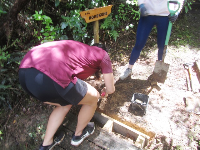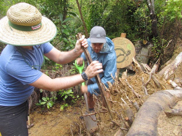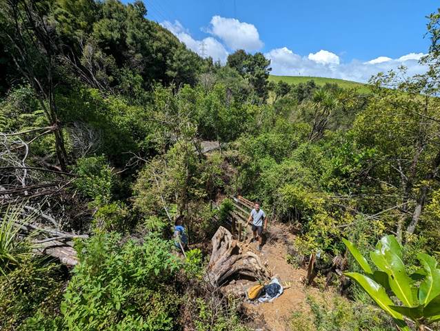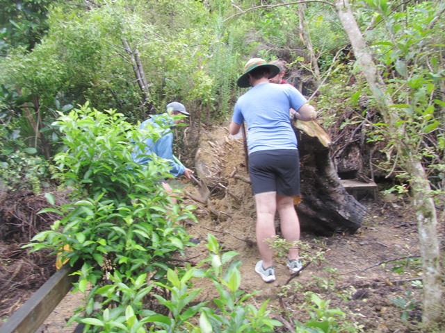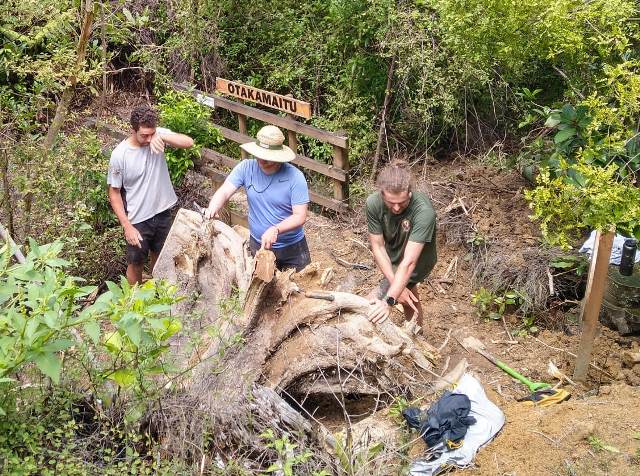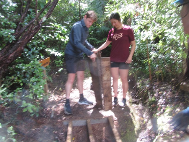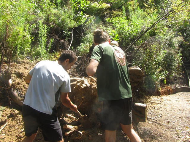 One team worked on clearing mud off of the stump that had fallen on the Ruru track so that we can chainsaw it down to a manageable size, and the other team worked on some general track fixup projects.