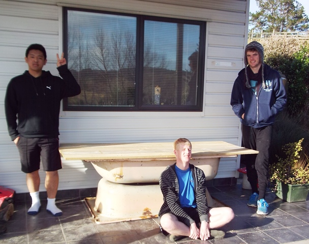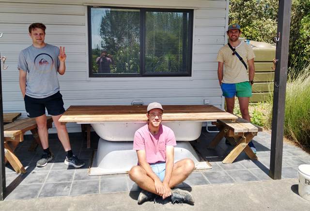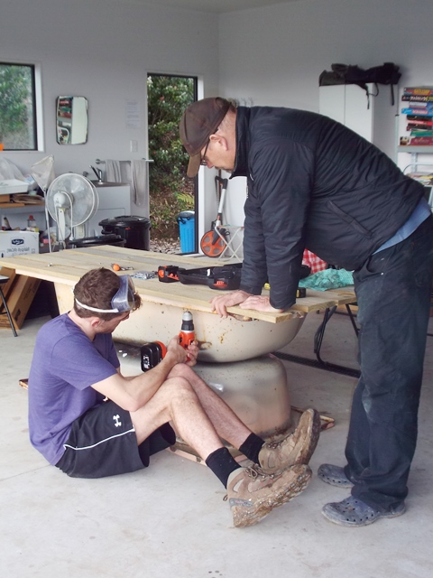 After a morning of hard work in mixed weather (wind, rain and sunshine all morning), we headed down for a relaxing late lunch. Jamie got a chance to enjoy the upcycled table he had helped build out of the old water trough bathtubs.