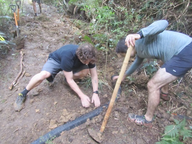 They decided that the best approach would be to dig a drainage ditch alongside the wet area so the water wouldn’t reach the track and then to divert the water under the track using a drain pipe. The job required a lot of digging.