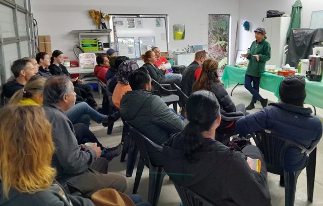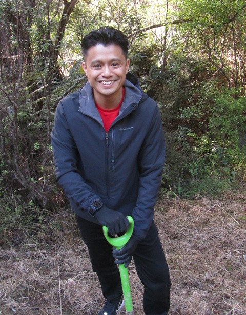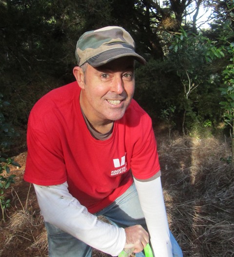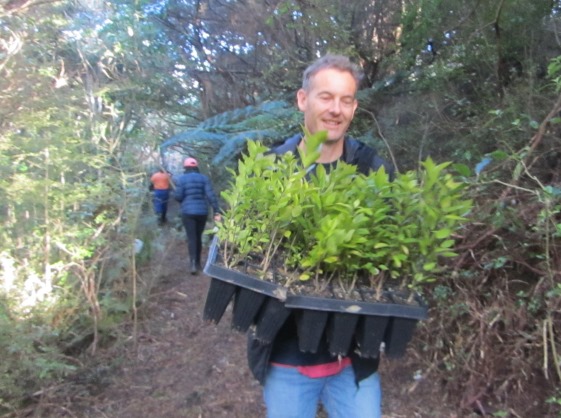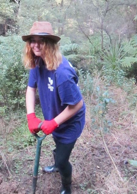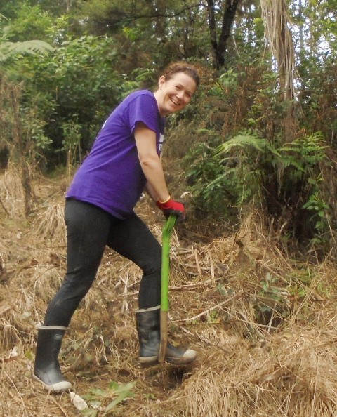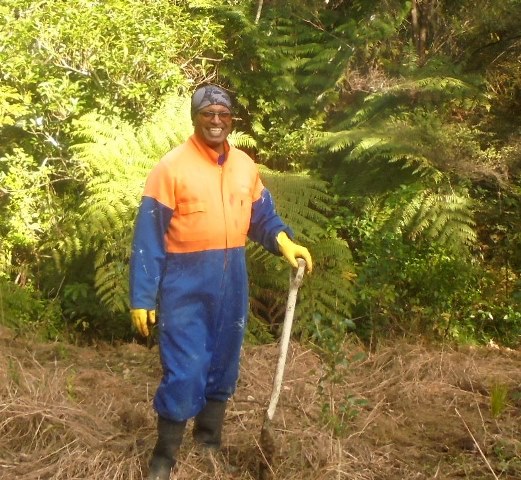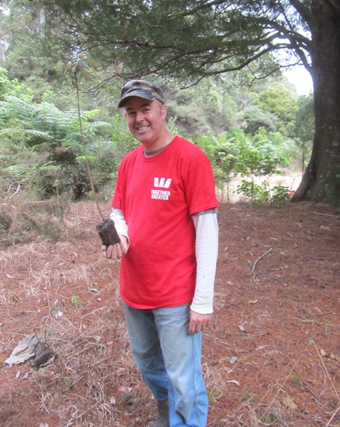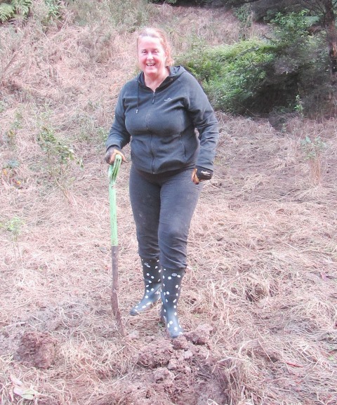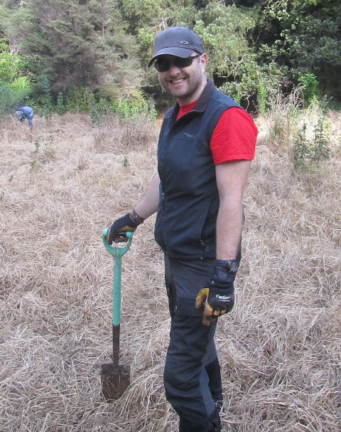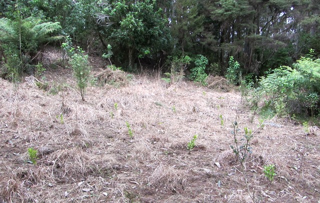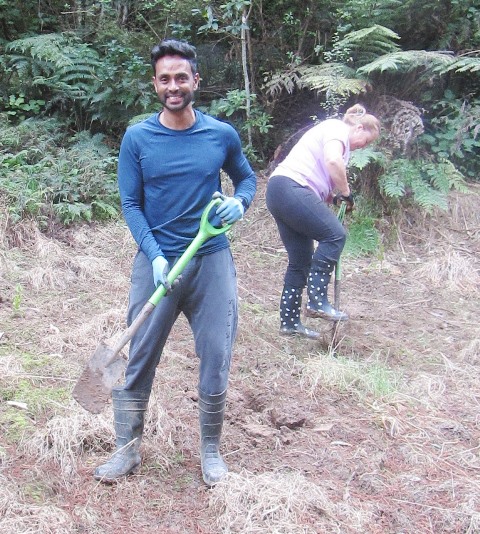 The plan was to plant pioneer trees in an area in one of the bush covenants on the property. Although there were several big stands of massive kahikatea, totara and taraire trees, there were also some large open spaces that had been covered with kikuyu grass which was preventing natural regeneration from taking place. In late summer, we prepared the area for planting by spraying out the kikuyu and volunteers from Halter helped construct a safe track down to the main planting site.