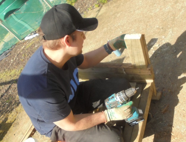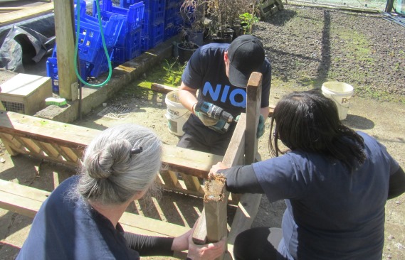 The team felt that it would be possible to replace the rotting boards with new timber. When the bench was installed, it was bolted down with brackets that were concreted into the ground. The first step therefore was to free the bench so we could take it down to the nursery for further work.