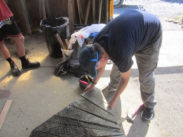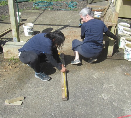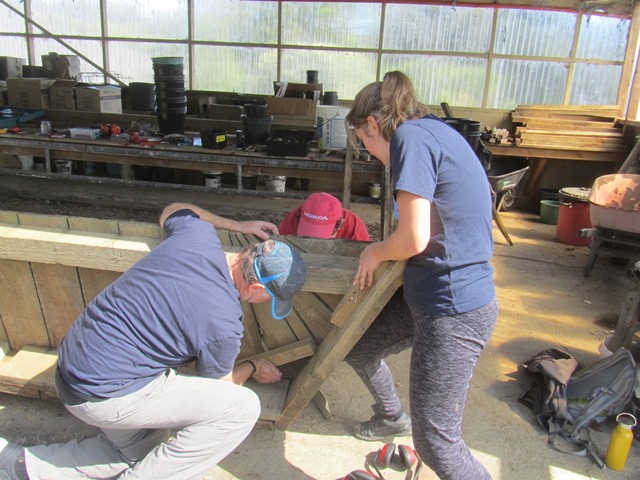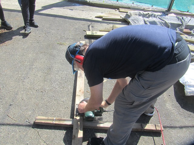 Once we got the boardwalk to the nursery, the team determined the size and number of reinforcing boards they would need and cut them to size.