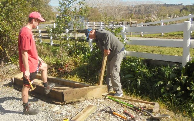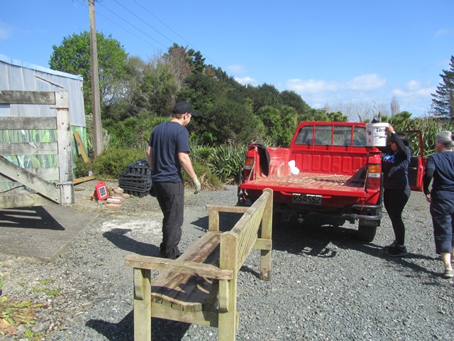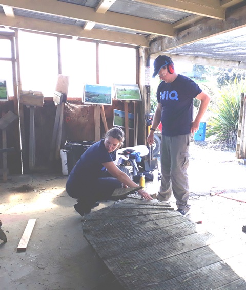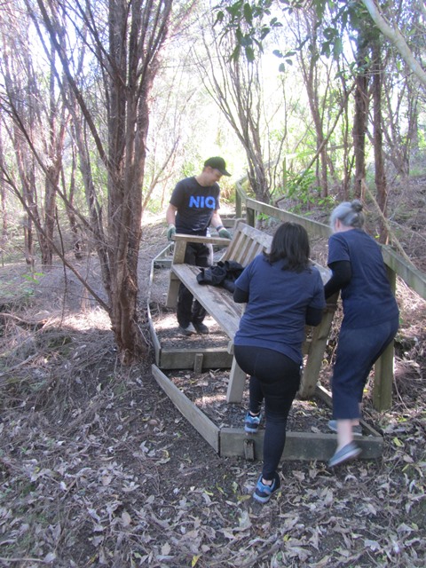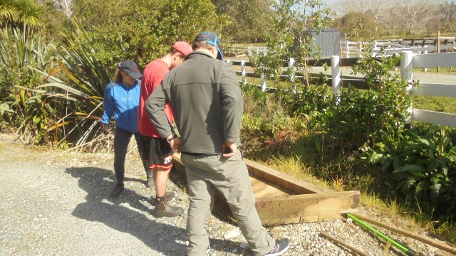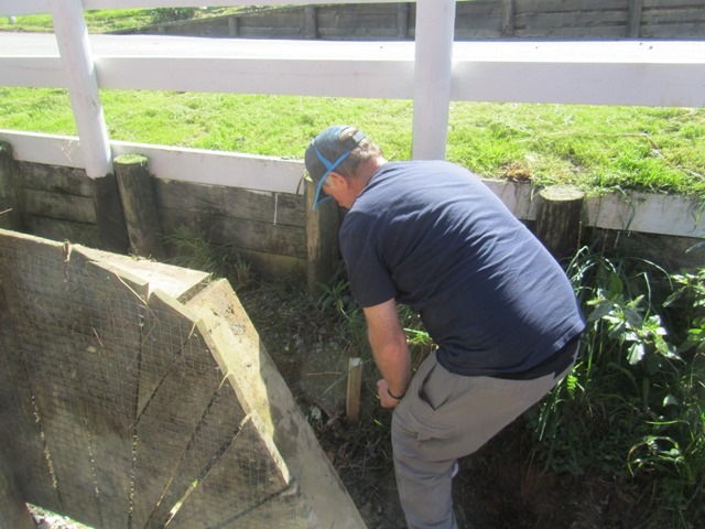The second team tackled an equally challenging job. There is a gate at the bottom of the main access road into the reserve, Huarahi Kowhai, that is usually kept locked. To allow for visitor walking access and bypass the closed gate without having to climb over it, we have built a small boardwalk over the drain along the side of the road.