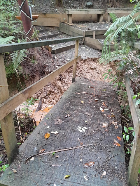 The bridge collapse has made the Taraire track unusable and created some challenges along the Riroriro track which will need to be rerouted to keep it away from the washout area.