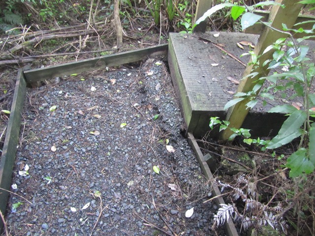 Our volunteer team last week determined that the best solution would be to extend the Taraire track parallel to the stream and establish a new crossing further upstream where there is less risk of future flooding. Instead of turning right onto the bridge, the track would now continue on until it reached the new crossing point.