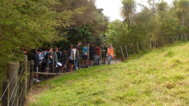 Near the top of the property, the students had a good look at the Kaipara Harbour. They were able to see how Wai Matauranga, the CUE Haven stream, feeds the Araparera River and in turn the Harbour. They were also able to see a variety of land uses—farming, forestry, restoration and residential adjoining the CUE Haven to put the different things they had heard and seen into perspective.
