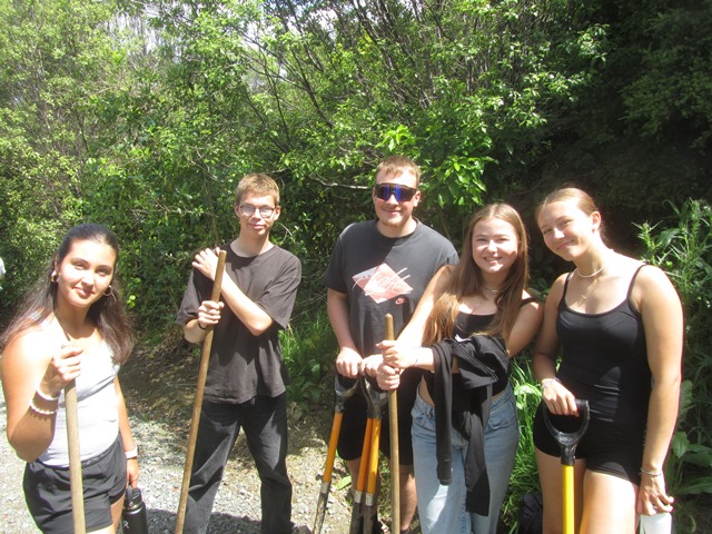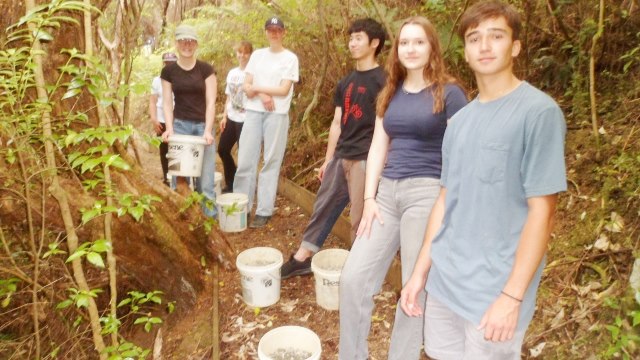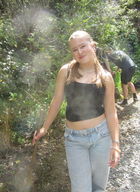 Along steep sections of the race we have drainage ditches to channel water away from the road and protect it from erosion and washouts. After winter rains, the drains and pipes can get blocked with leaves, gravel and twigs which reduces their effectiveness. We requested some of the students to walk down the track and clear the drains as they went.