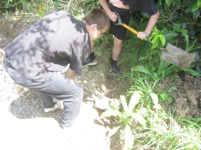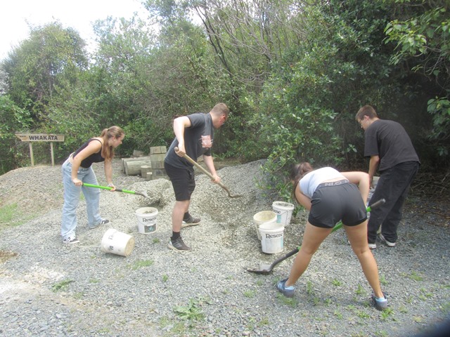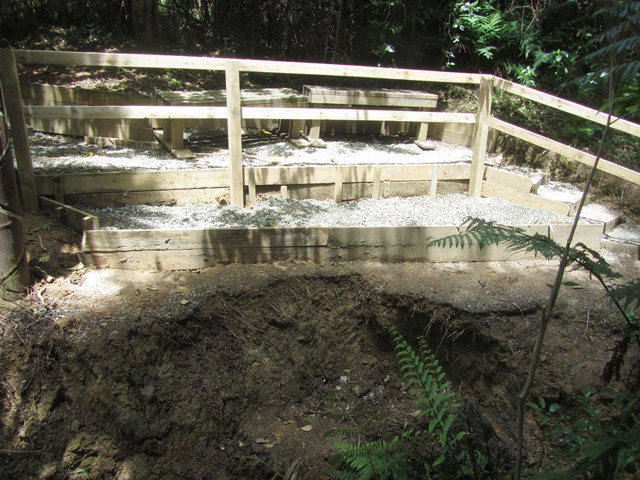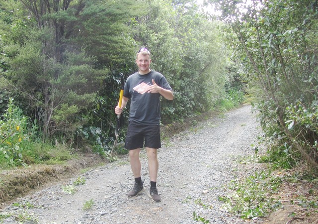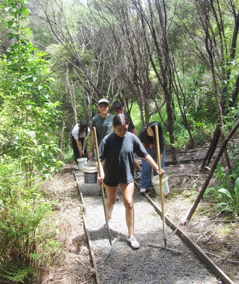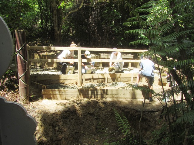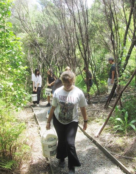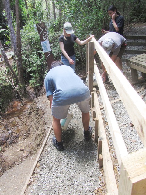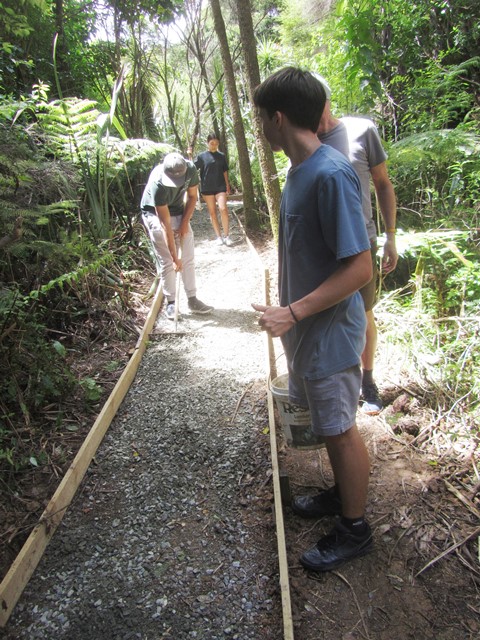 The last task of the day was to help finish off the repairs to the Taraire and Riroriro tracks by putting down a layer of metal to make the tracks ready for year round use. For the past two months, we have been working on repairing damage done by stream flooding with washed out the bridge connecting the Taraire and Riroriro track and this was the last major step in the repair work.