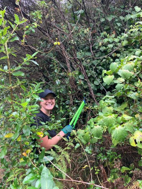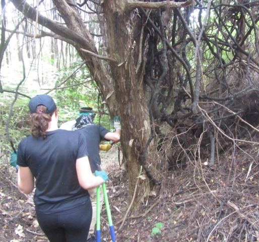 One of the big challenges with controlling the plant is that where you see it growing and where it actually comes from can be two different things. Rather than just trimming the edges, we wanted to find where the source and cut it off as close to ground level as possible. The team wasn’t shy about following the vines into the bush and cutting and pulling them out.